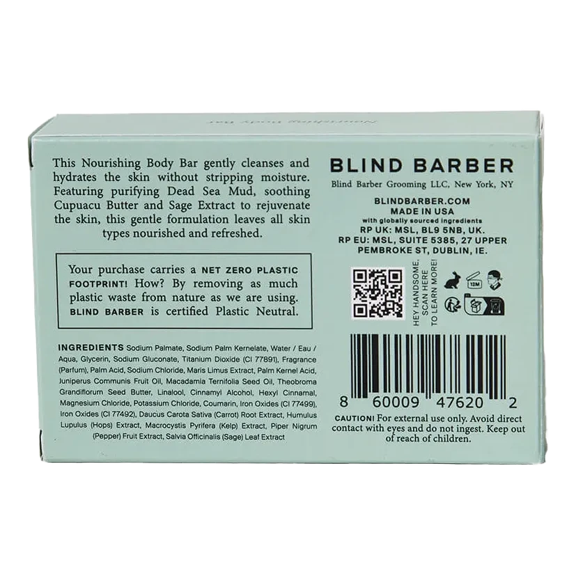 Denne kroppssÄpen fra amerikanske Blind Barber er bÄde mild og nÊringsrik. Den renser skÄnsomt huden din mens den tilfÞrer masse fuktighet. SÄpen inneholder rensende DÞdehavs-leire, beroligende Cupuacu-smÞr og salvieekstrakt for Ä fremme celleregenerering. Blind Barber Nourishing Body Bar etterlater huden ren, myk og velduftende. Passer for alle hudtyper.