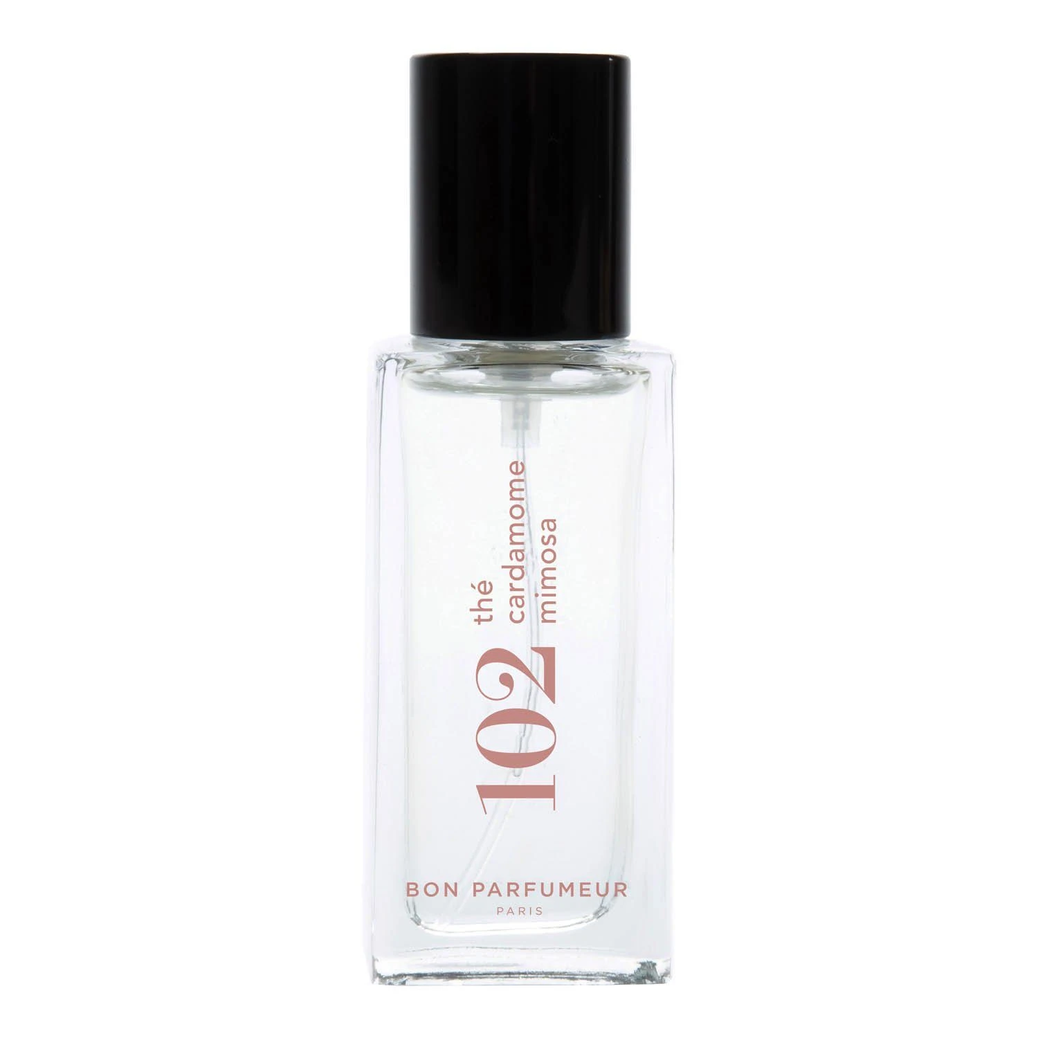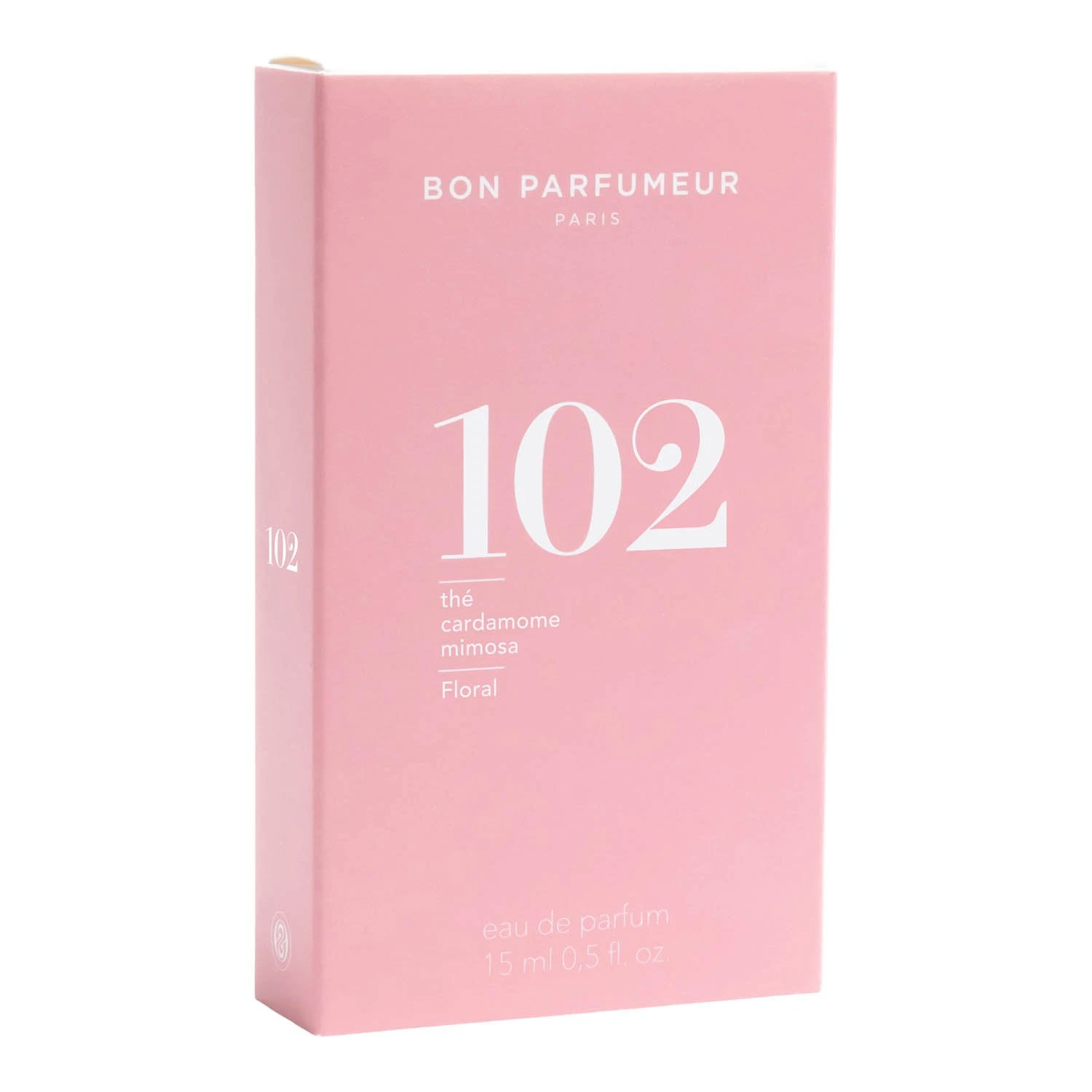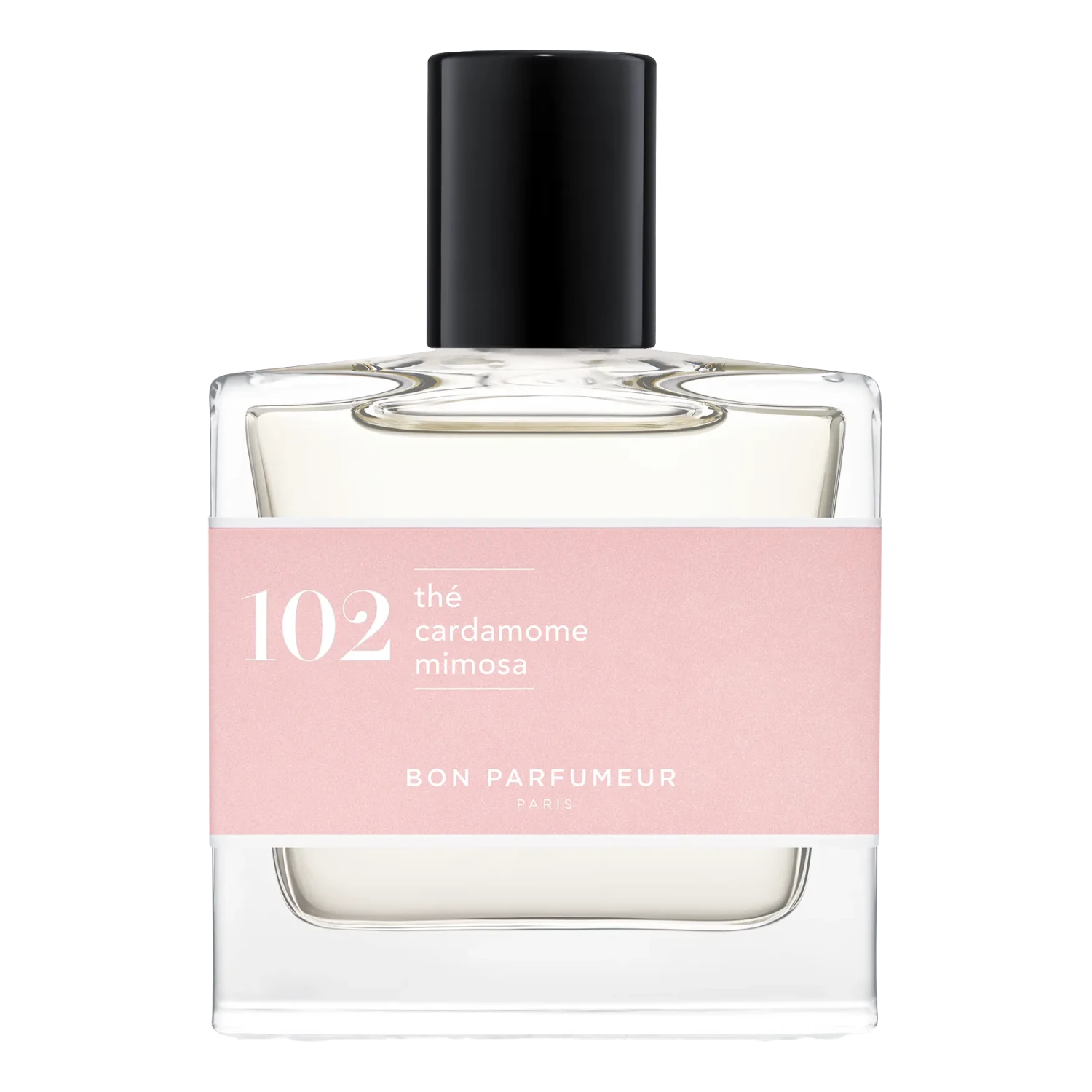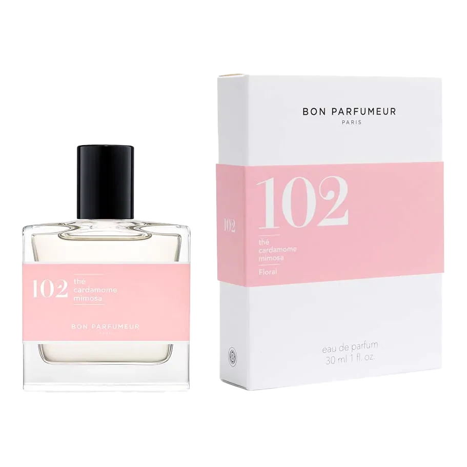 102 er en del av floral-serien til Bon Parfumeur og vil tradisjonelt sett vÊre mer pÄ den feminine siden. Vi oppfordrer imidlertid til Ä tenke utenfor boksen og gir ikke noen fÞringer pÄ hvem som skal kunne bruke hva. Duften kan beskrives som en delikat blanding av grÞnne krydder og frisk te som gÄr over til en myk musk.
