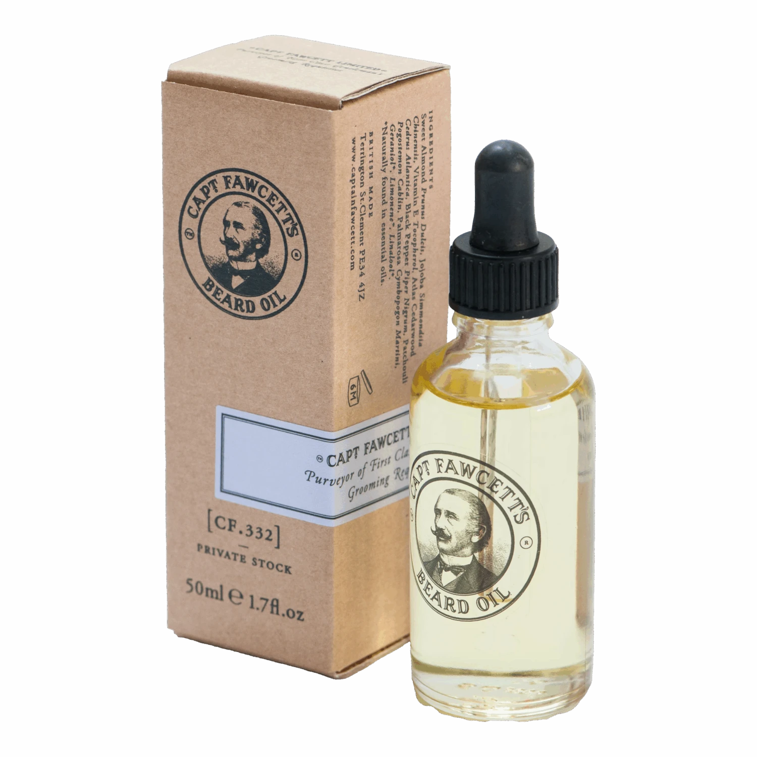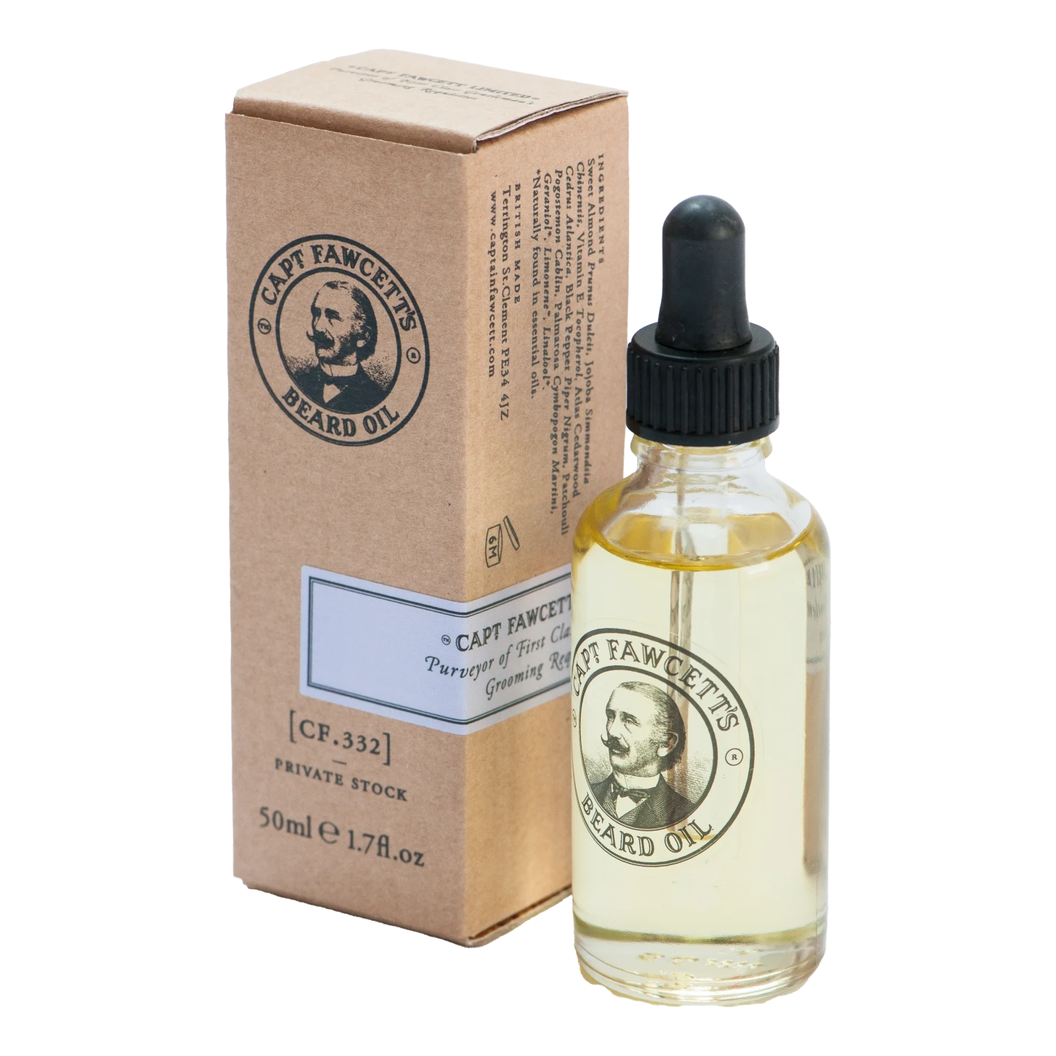 Captain Fawcett’s Private Stock skjeggolje bestĂ„r av en nydelig kombinasjon av essensielle oljer, blant annet mandel, jojoba og vitamin E. For en behagelig og maskulin duft er det tilsatt oljer fra sedertre, sort pepper, patchouli og palmarosa, som er en underart av sitrongress. Et par drĂ„per av denne skjeggoljen gir fuktighet til huden under skjegget og minsker derfor klĂže og flass. I tillegg vil skjeggoljen gi en god duft og glans til skjegget.