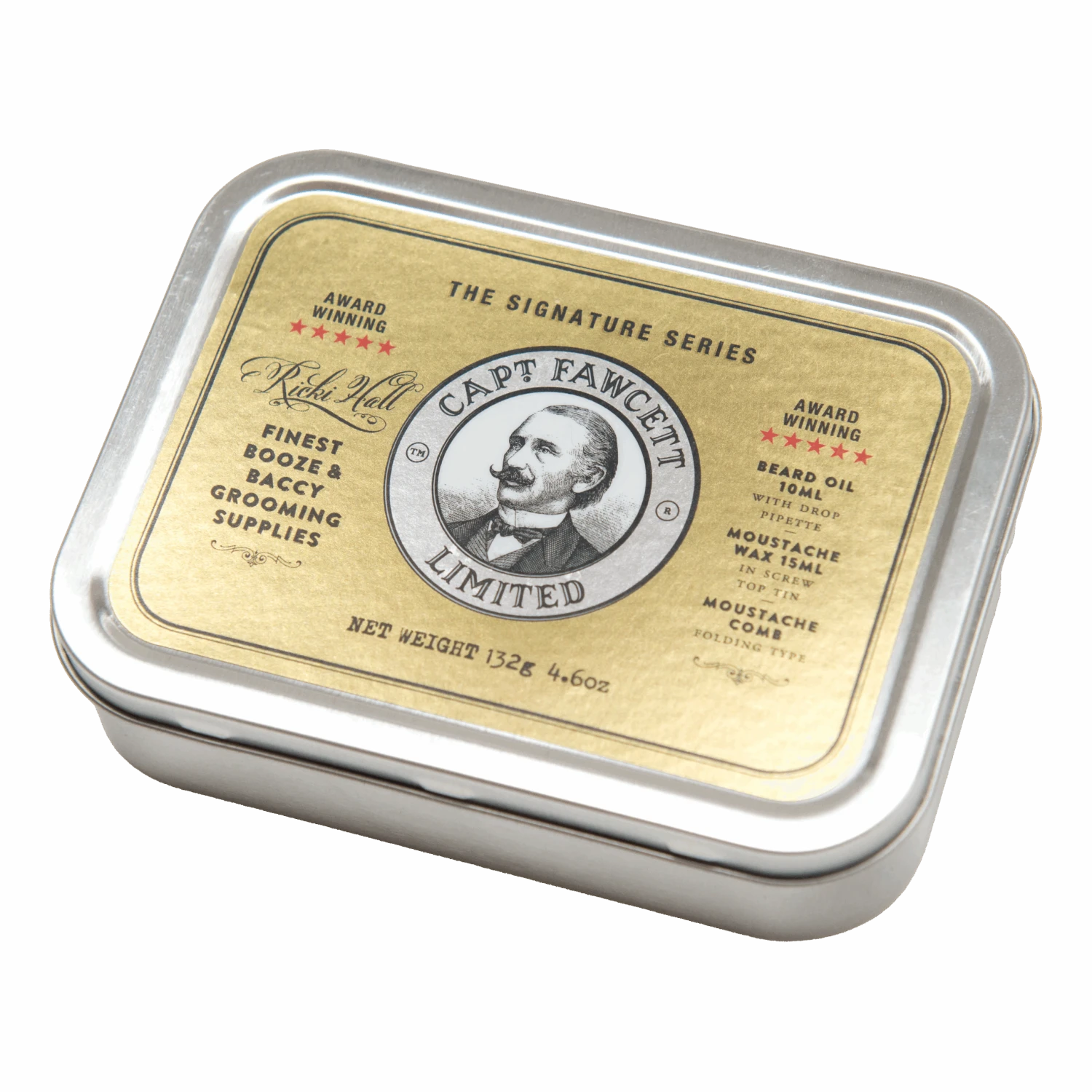 Dette settet er skapt for deg som Þnsker Ä opprettholde en upÄklagelig skjegg- og bartestil, uansett hvor dagen tar deg. Dette settet er en komplett lÞsning for pleie og styling, pakket i en sjarmerende, tradisjonell tobakkeske.