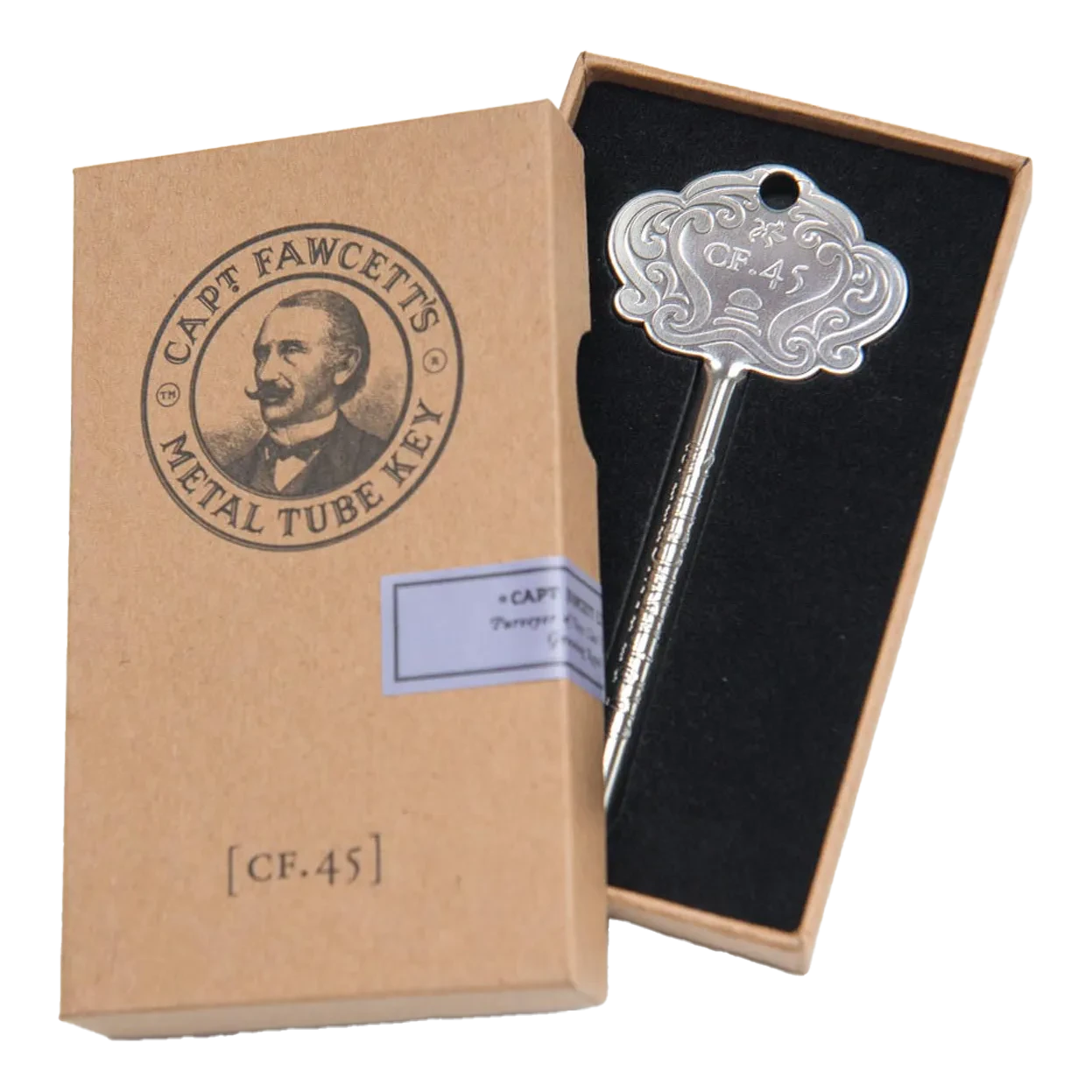 Er det ergerlig å kaste en tube med barberkrem eller aftershave når du vet det ligger minst to barberinger til på innsiden uten at du klarer å klemme dem ut? Captain Fawcett har en svært vakker løsning i rustfritt stål! Smyg enden på tuben inn i hakket på den ene siden og bruk nøkkelhodet til å vri for å få ut produktet. På den måten slipper du å kvitte deg med barberkremtuben før alt er brukt opp!