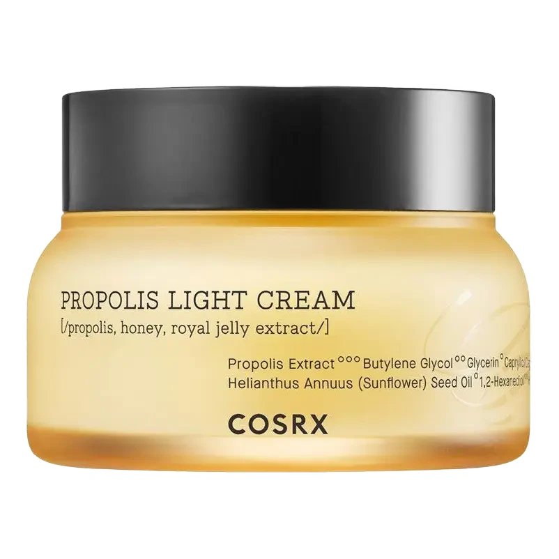COSRX Full Fit Propolis Light Cream er en lett, men nĂŠrende ansiktskrem som passer for alle hudtyper. Kremen inneholder 65 % svart biepropolis, som er kjent for sine fuktighetsgivende og styrkende egenskaper. Den lette teksturen gjĂžr at kremen raskt absorberes i huden, noe som gir en umiddelbar fĂžlelse av fukt og komfort.