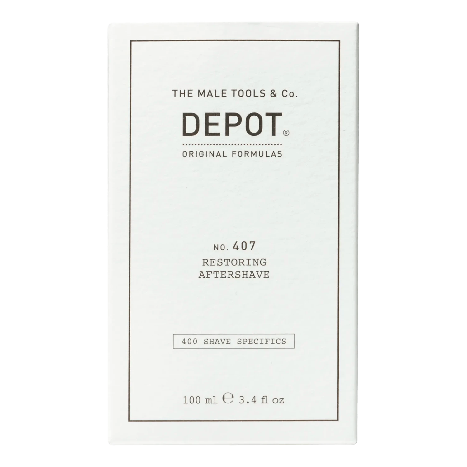 Eksklusivt etterbarberingsvann fra Depot – The Male Tools & Co. Alle produkter i 400-serien er til barbering, og No. 407 er en aftershave som effektivt desinfiserer og frisker opp huden etter barbering. Setter ogsĂ„ en diskret godlukt. Kan enten brukes alene av den med fet hud eller i forkant av ansiktskrem/etterbarberingskrem av den med normal eller tĂžrr hud.