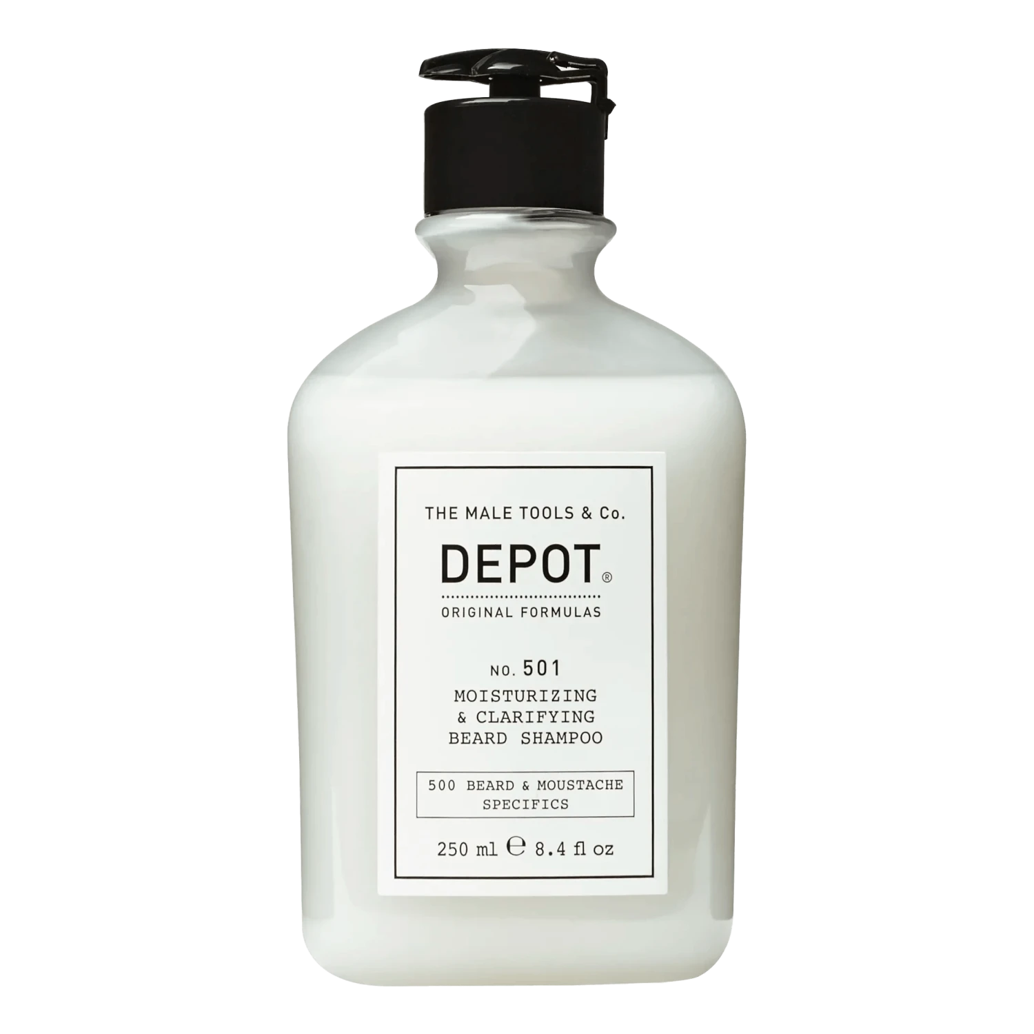 Pleiende sjampo til skjegg fra Depot – The Male Tools & Co. Alle produkter i 500-serien er til skjeggpleie, og No. 501 er en fuktighetsgivende skjeggsjampo som legger fundamentet for et rent, mykt og sunt skjegg. Formulert uten SLES eller andre hissige, overflateaktive stoffer.