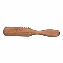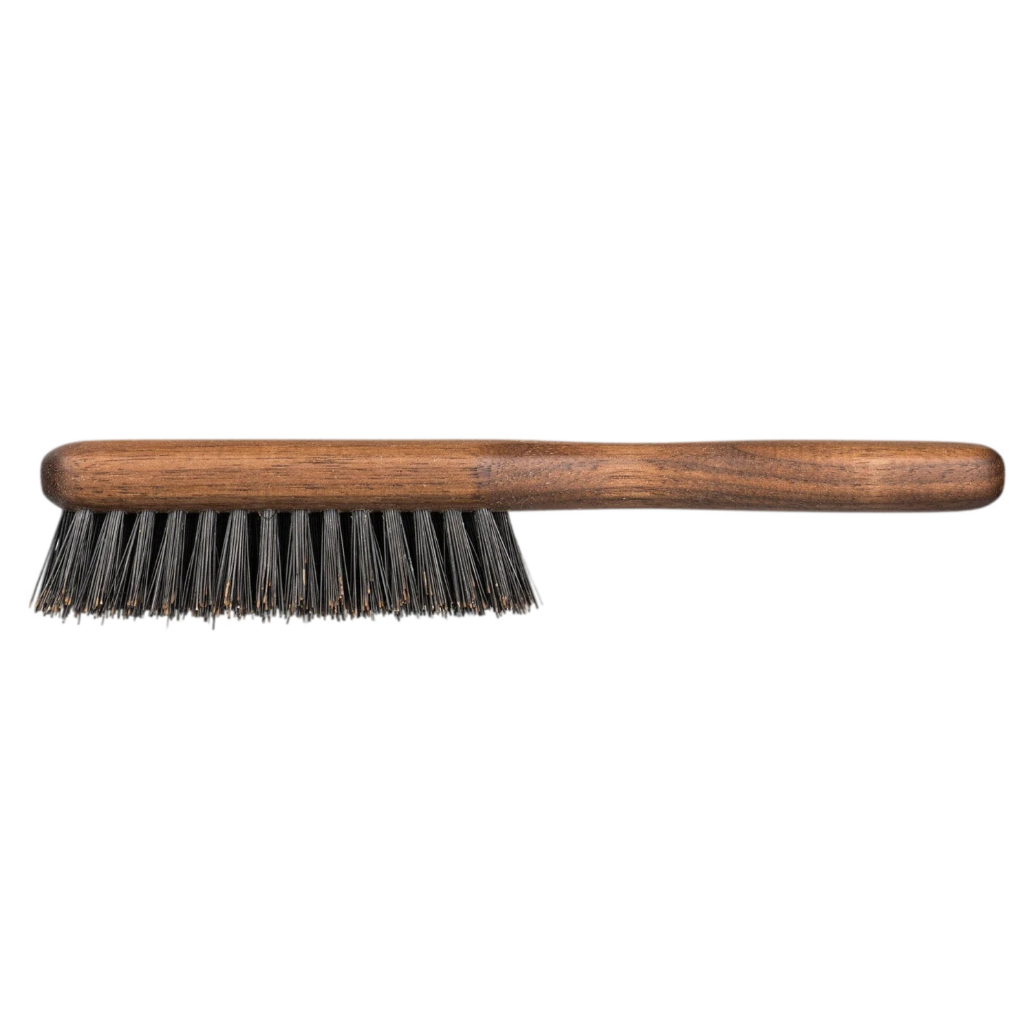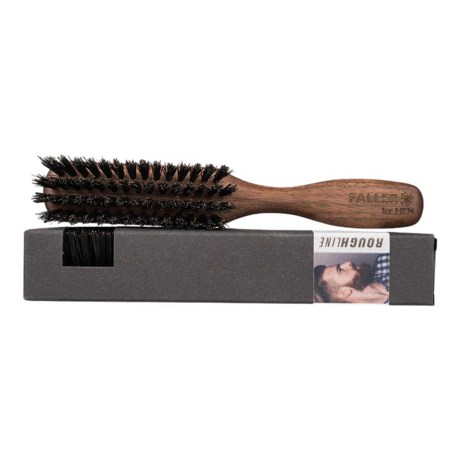 Skjeggbørsten fra Faller RoughLine laget av rustikt valnøttre og villsvinbust. Den myke busten er ideell for å forme skjegget til en kompakt og ryddig fasong, samtidig som den skånsomt masserer huden under skjegget.