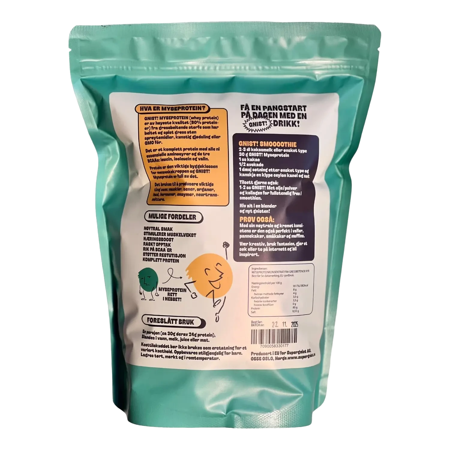 Myseprotein fra frittbeitende, gressfĂŽret melkekyr! Myseprotein er minimalt bearbeidet og har hĂžyere nivĂ„er av antioksidanter og andre nĂŠringsstoffer enn konvensjonelle mysepulver. Ingen tilsatt soyalecitin, sĂžtningsmidler, konserveringsmidler eller fyllstoffer.Â