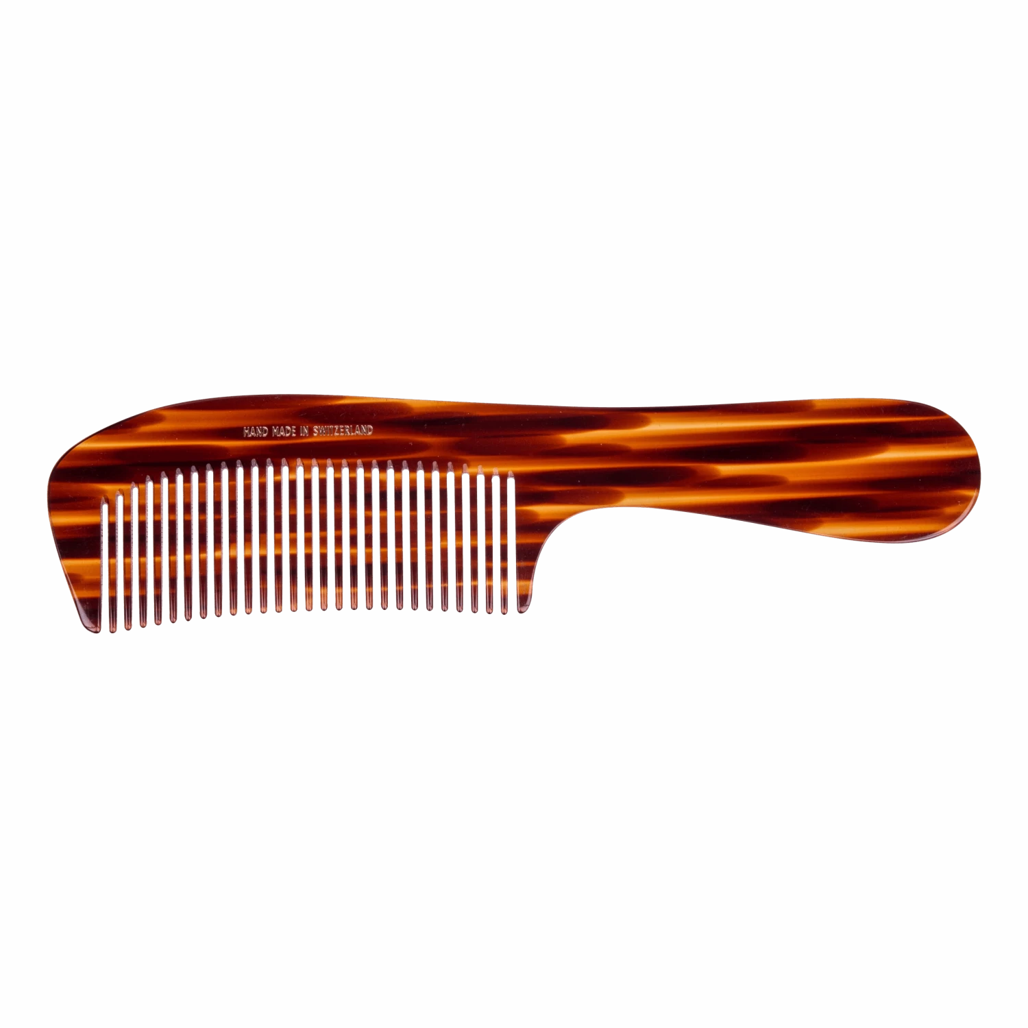 Denne hårkammen med avrundet håndtak er håndlaget i Sveits, noe som sikrer enestående kvalitet og presisjon i hvert eneste produkt. Laget av celluloseacetat, et materiale utvunnet fra organisk materiale, gir denne kammen både holdbarhet og et elegant utseende. Celluloseacetatet blir først klemt til en solid blokk før det blir delt opp i plater, som deretter håndsages og poleres til perfeksjon. Dette gir en glatt overflate som glir lett gjennom håret uten å dra eller skade det.
