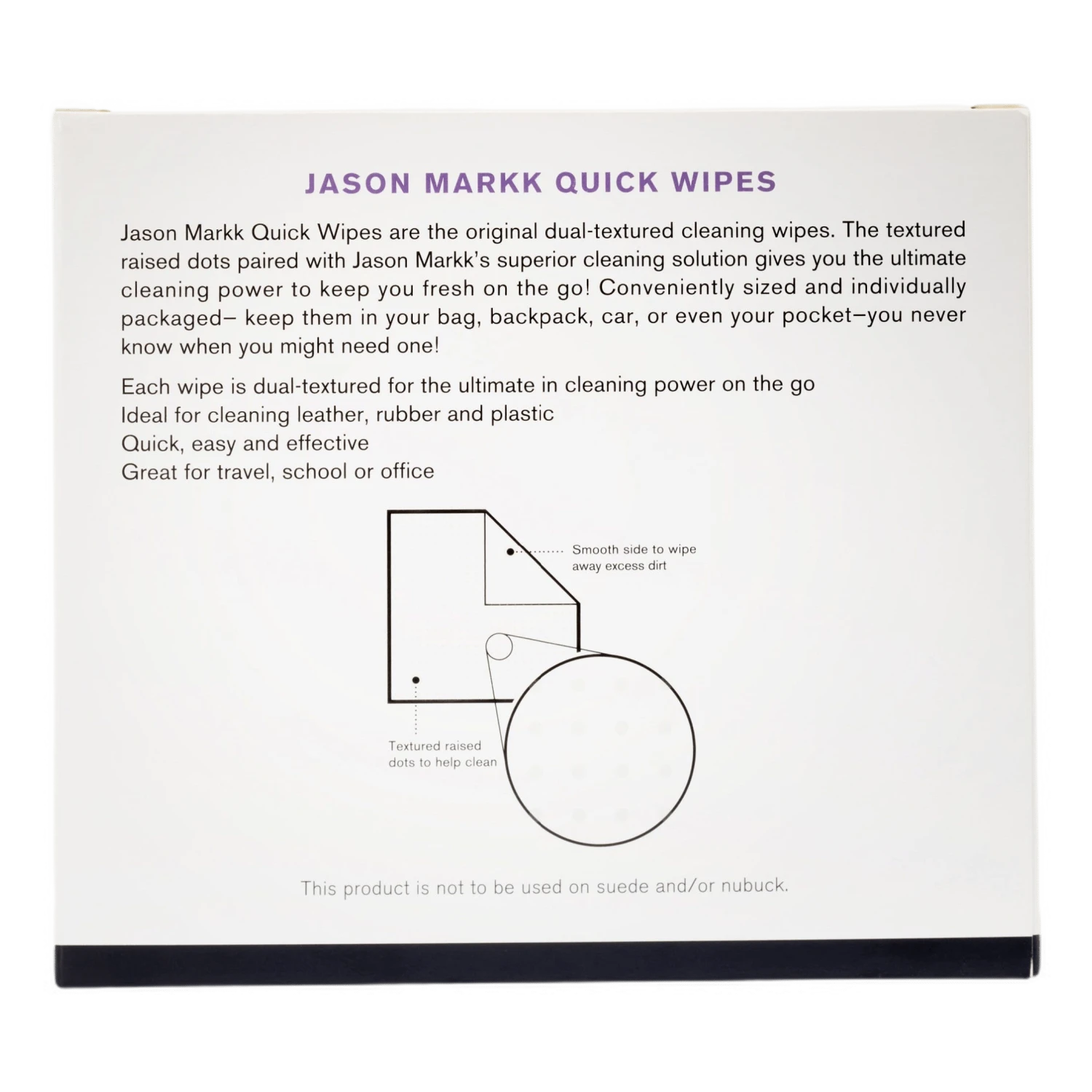 Disse klutene er ikke ment for bruk pÄ semsket skinn, sÄ vÊr oppmerksom pÄ dette nÄr du rengjÞr skoene dine. Med Jason Markk Quick Wipes fÄr du en pÄlitelig rengjÞringslÞsning som holder skoene dine friske og rene.