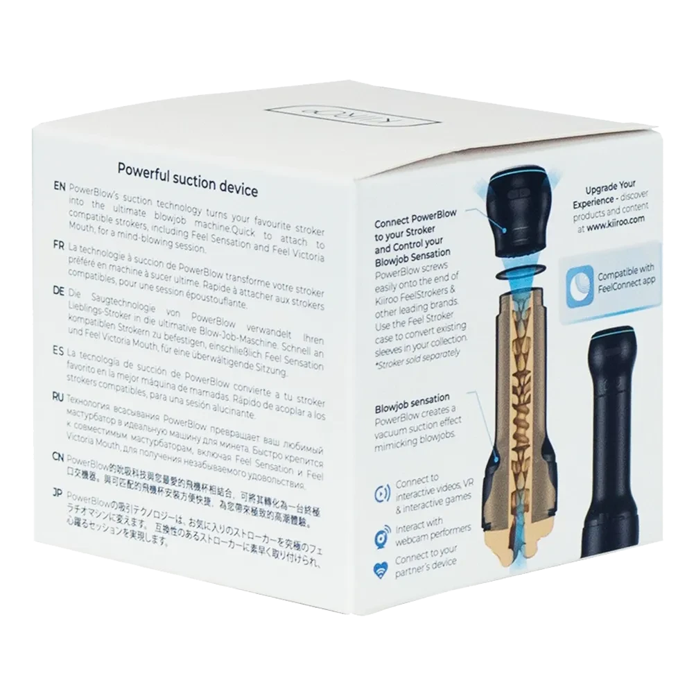 PowerBlow brukes med Feel Stroker fra KIIROO og forvandler masturbatoren i en interaktiv blowjobmaskin. SugepÄsatsen skrus ganske enkelt pÄ Feel Stroker, og sugemodus justeres per tastetrykk pÄ masturbatoren eller pÄ telefonen med Bluetooth og app.