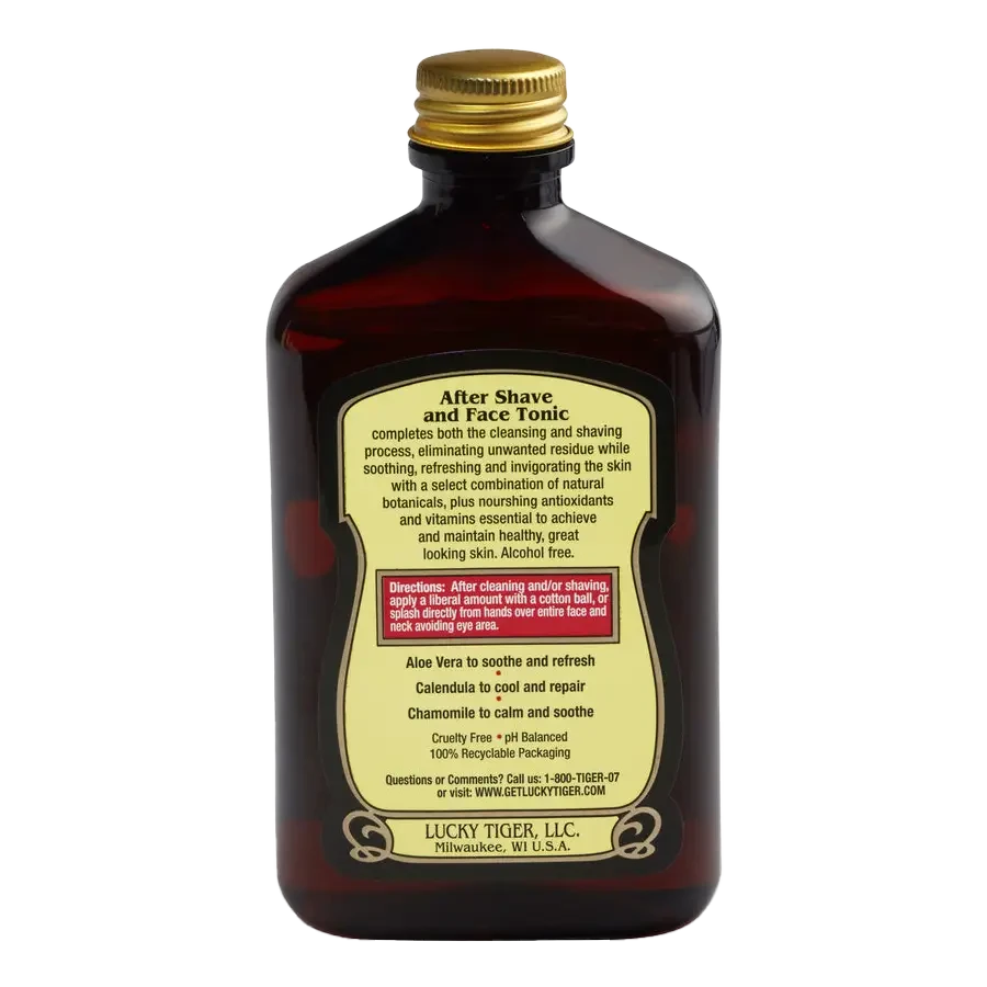Etter en god barbering er en Lucky Tiger klar for sitt neste eventyr. Lucky Tiger After Shave & Face Tonic kombinerer after shave og toner i en flaske, og fullfĂžrer rengjĂžrings- og barberingsprosessen. Denne moderne klassikeren gir ny energi og fuktighet til huden, noe som er essensielt for Ă„ opprettholde en sunn og frisk ansiktshud.
