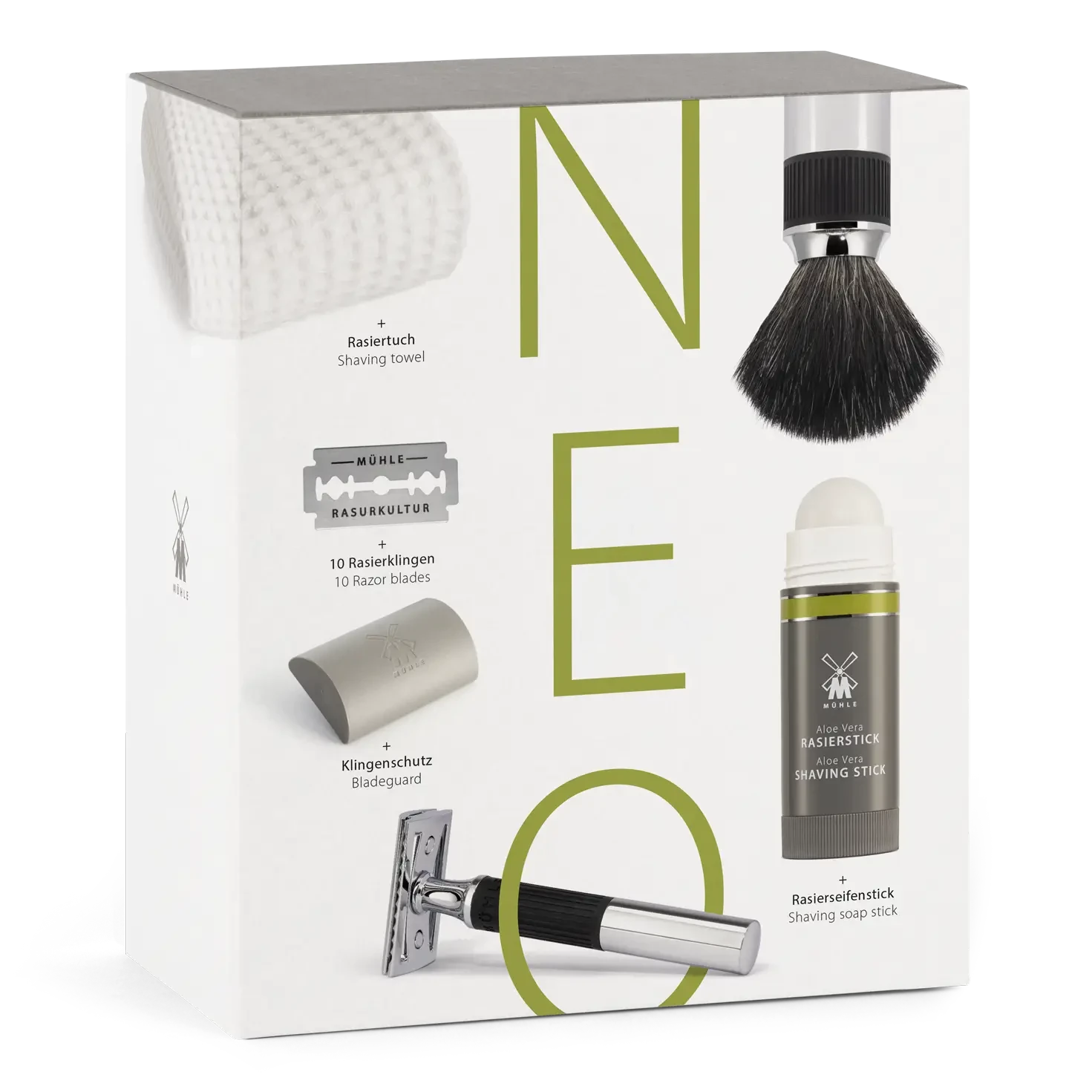 NEO markerer inngangen til tradisjonell barbering. Settet inkluderer en barberhøvel og matchende barberkost med vegansk Black Fibre. Tysk kvalitet som er produsert i Mühle sin egen fabrikk i Tyskland. Barberhåndkleet er laget av den fineste vaffelpiké.