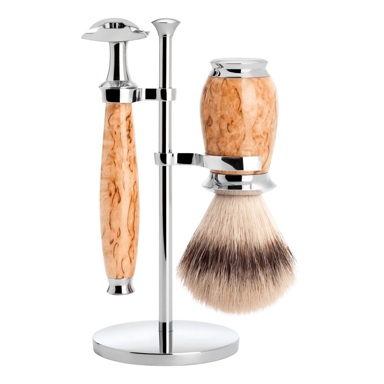 Stativ av forkrommet messing. Hårene i barberkosten er av fineste Silvertip grevlinghår eller Silvertip Fibre som er syntetiske hår. Busten kan også enkelt byttes ut, så dette er et barbersett for livet.