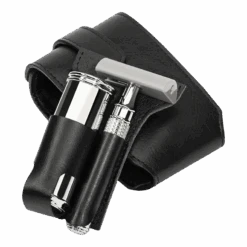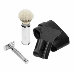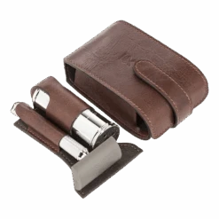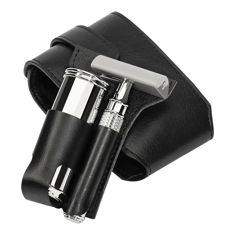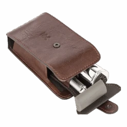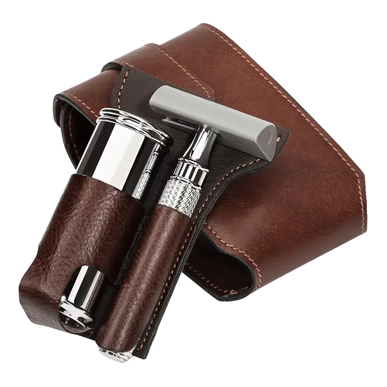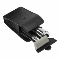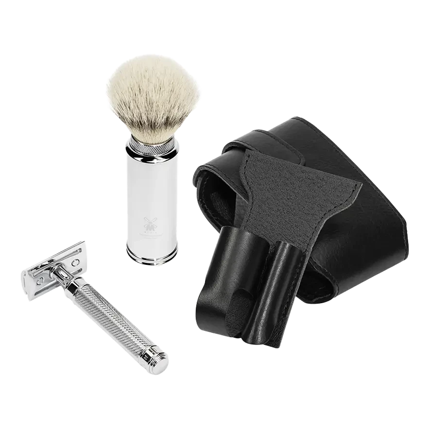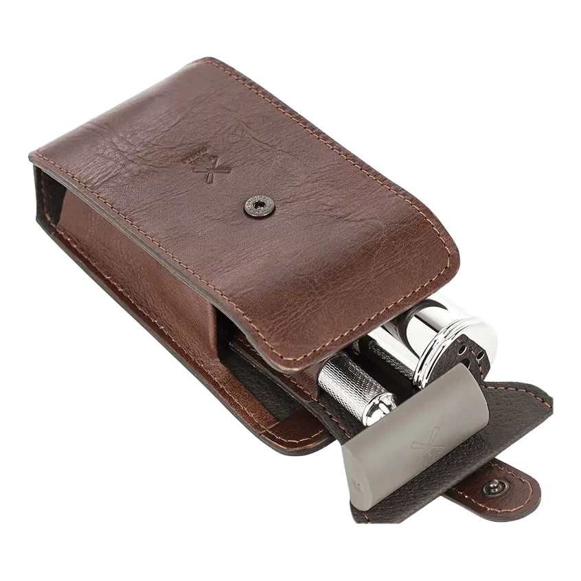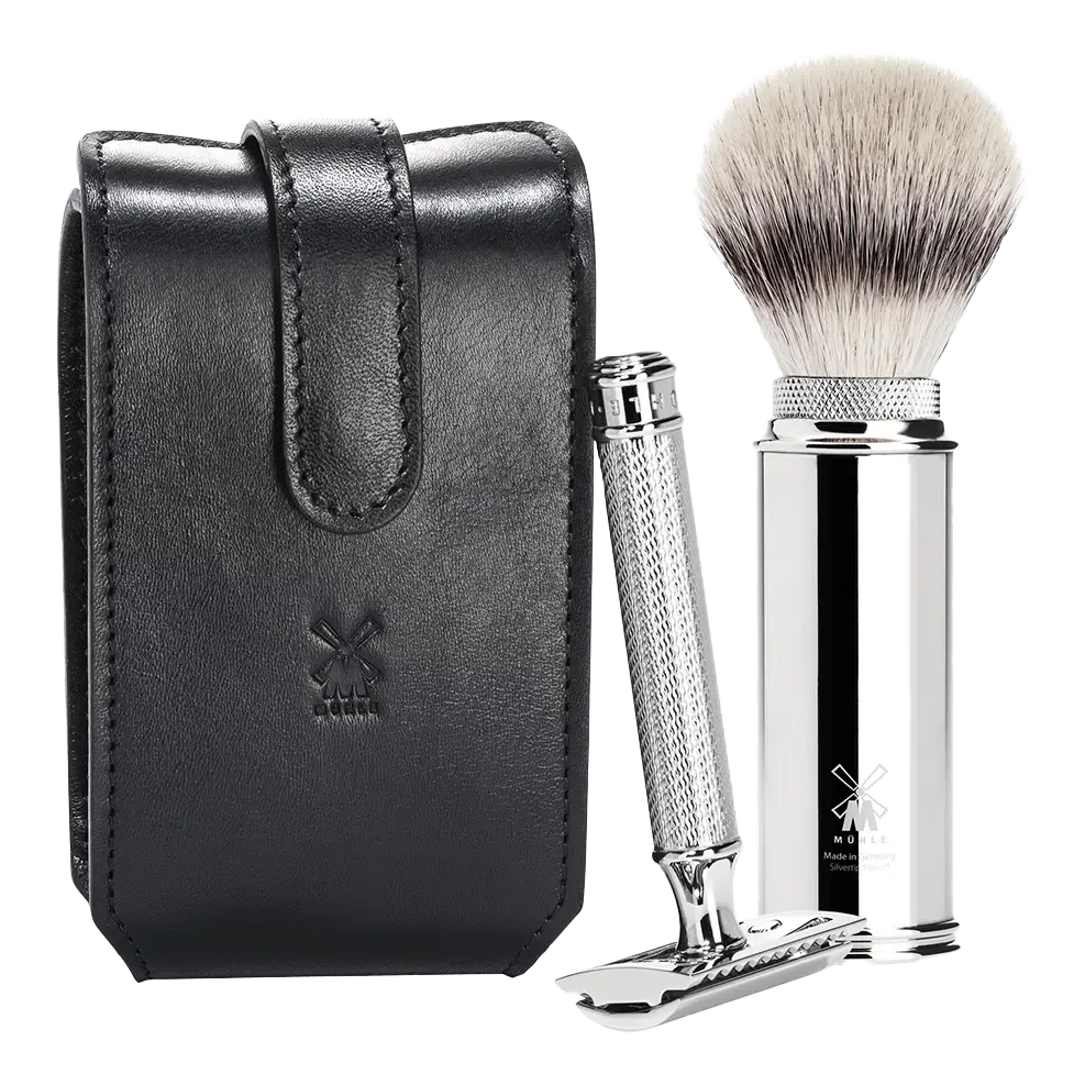 Reisesett i voldsomt flott håndlaget skinnetui fra tyske Mühle. Med i settet får du også en Mühle R89 tradisjonell barberhøvel som ble testvinner i TV2 hjelper deg samt en Silvertip Fibre sammenleggbar barberkost perfekt til reise.