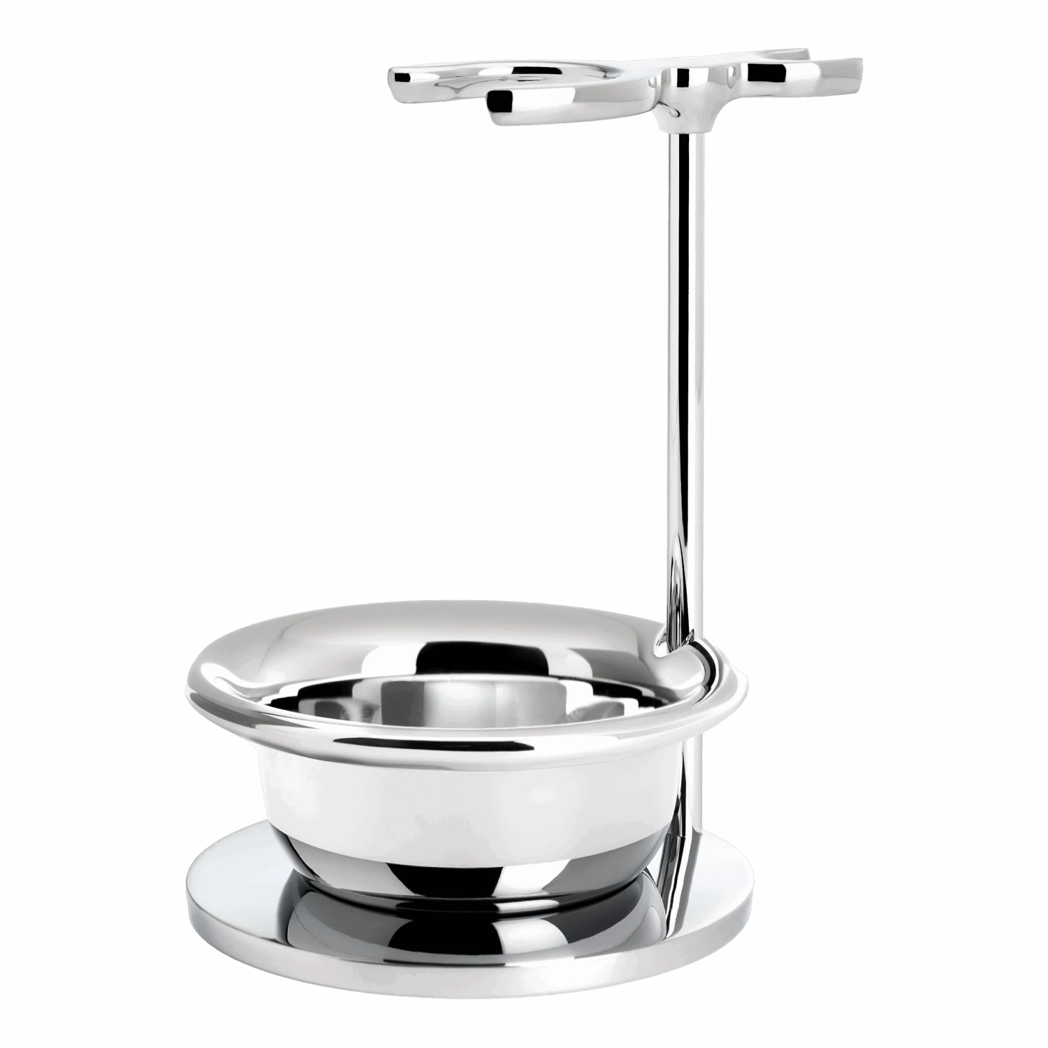 Et stilig og solid forkrommet stativ til oppbevaring av en barberkost og barberhøvel. I tillegg følger det med en skål i polert krom.