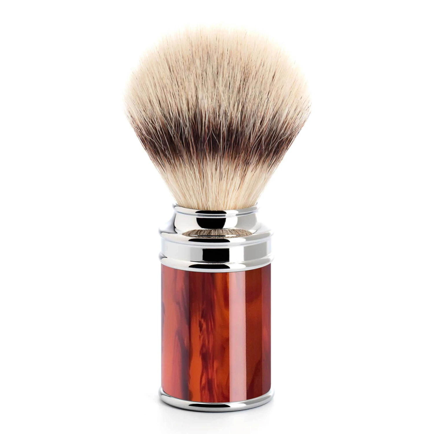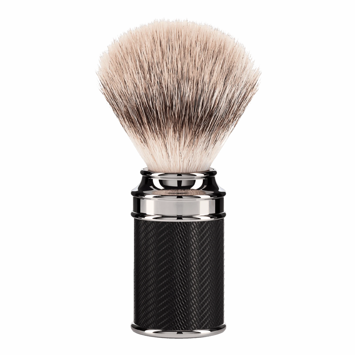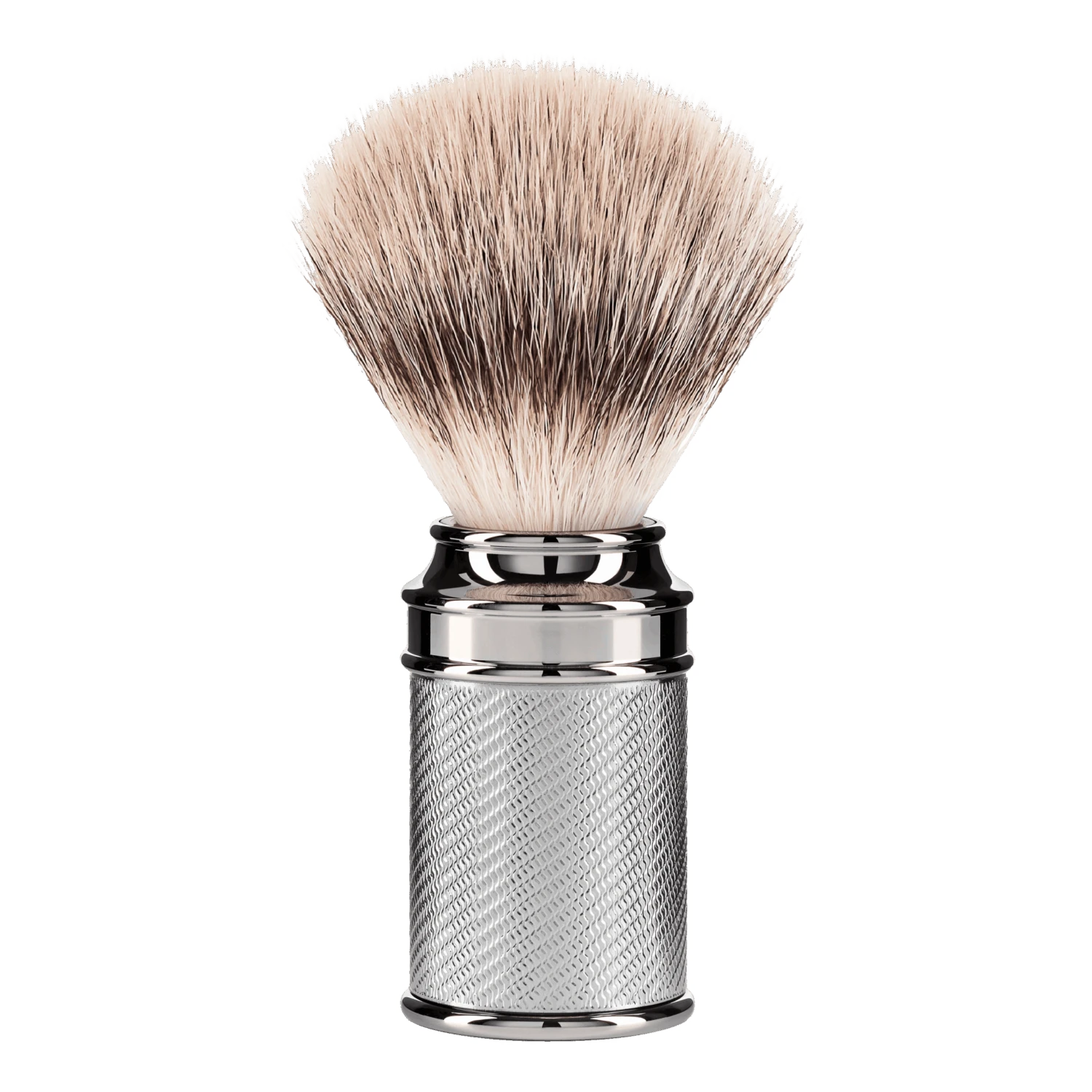 En meget stilig barberkost fylt med Silvertip Fibre, en ny type syntetisk fiber som er meget myk og naturtro. Passer perfekt for deg som ikke ønsker å bruke produkter fra dyr. Skaftet er støpt i messing, belagt med nikkel, for så å bli forkrommet. Passer perfekt til Mühle R89 og R89 Grande barberhøvel.
