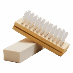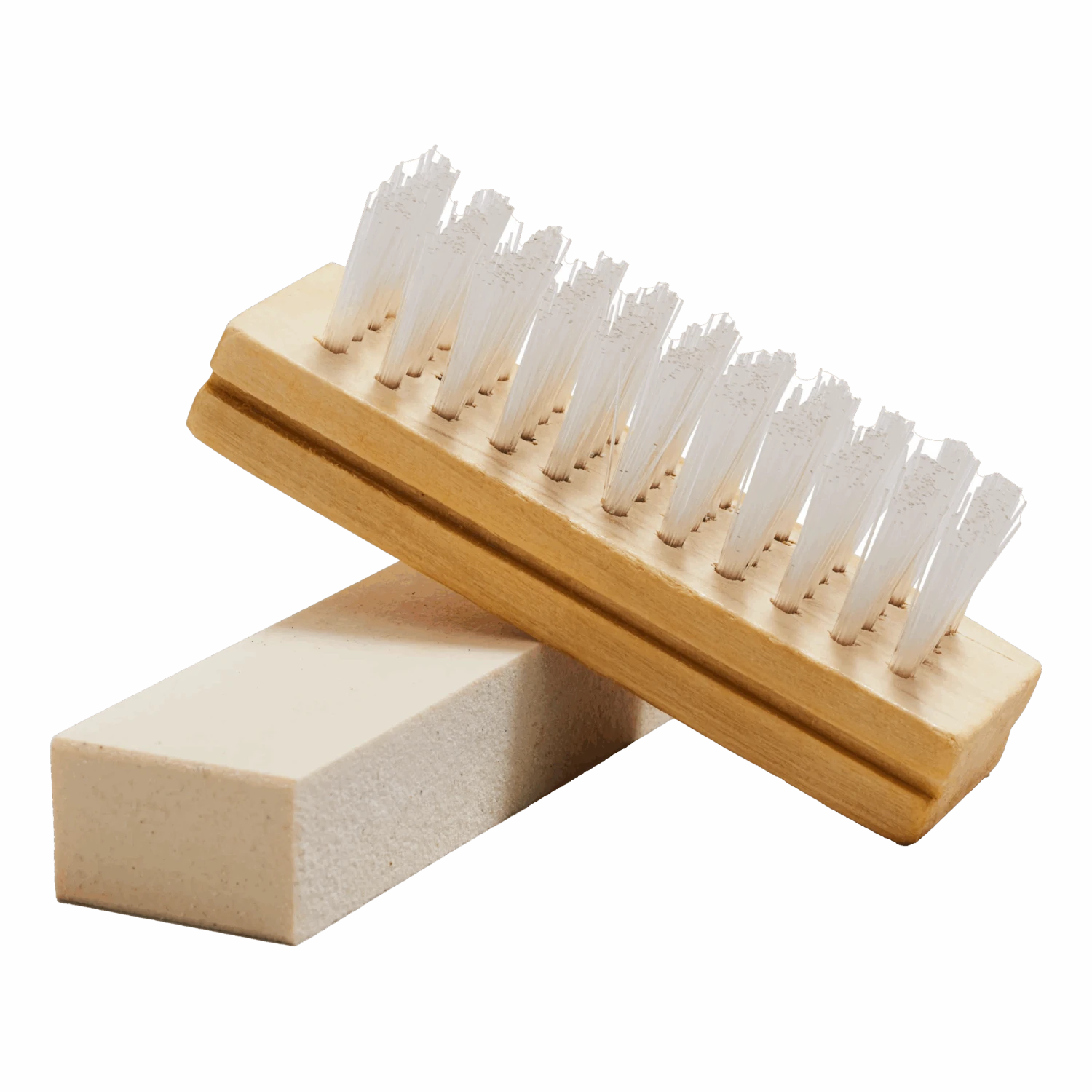 Roughout/Nubuck Cleaner Kit fra Red Wing for vedlikehold av grovt skinn og nubuckskinn med en to-trinns tilnĂŠrming. Settet inkluderer en rense-bar for Ă„ fjerne merker og en kombinasjon av nylon- og messingbĂžrste for Ă„ fjerne rusk og gjenoppretting av skinnets struktur.