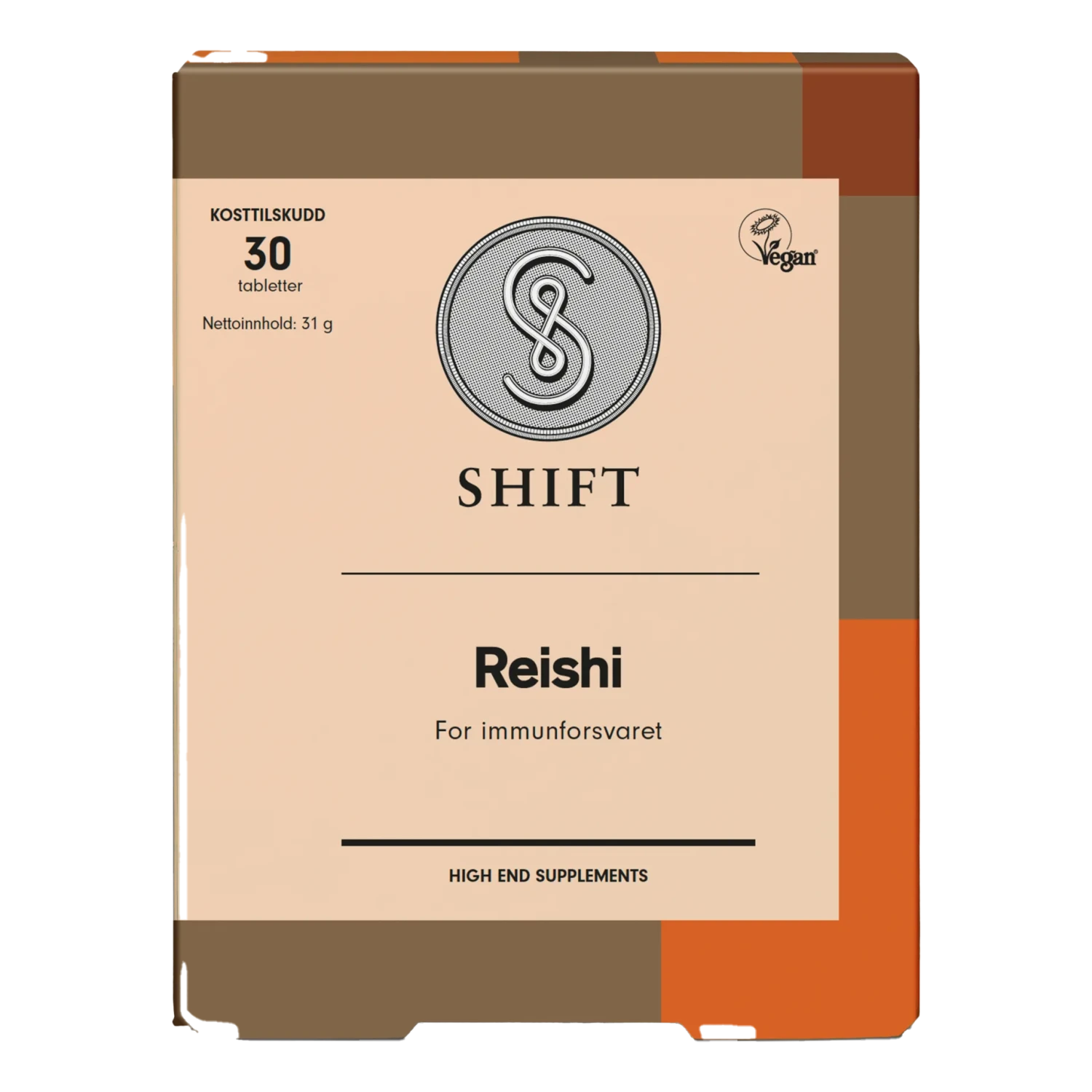 Reishi fra SHIFT inneholder RÞd Reishi som er duo-ekstrahert for maksimal effekt. RÞd Reishi er et kraftig adaptogen og sett pÄ som selve kongen av medisinske sopper i Kina og Japan. RÞd Reishi ble brukt gjennom Ärtusener av keisere og hÞytstÄende Taoister som den mest helsebringende eliksir. RÞd Reishi sies Ä gjenopprette ulike kroppsfunksjoner nÄr disse er i ubalanse, styrke immunforsvaret og fungere som en kraftig antioksidant. Duo-ekstrahert gjennom bÄde vannlÞselig og alkoholbasert ekstraksjon for Ä trekke ut alle virkestoffene. Tidligere navn: SuperReishi