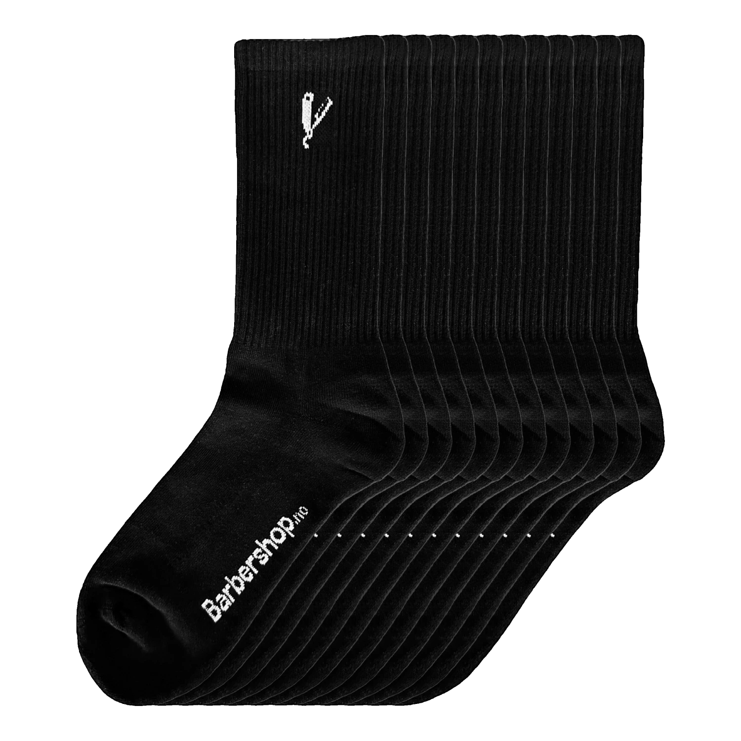 6 par sorte bomullsokker med motiv av en barberkniv og Barbershop.no under sÄlen (ikke synlig nÄr du gÄr med de).
