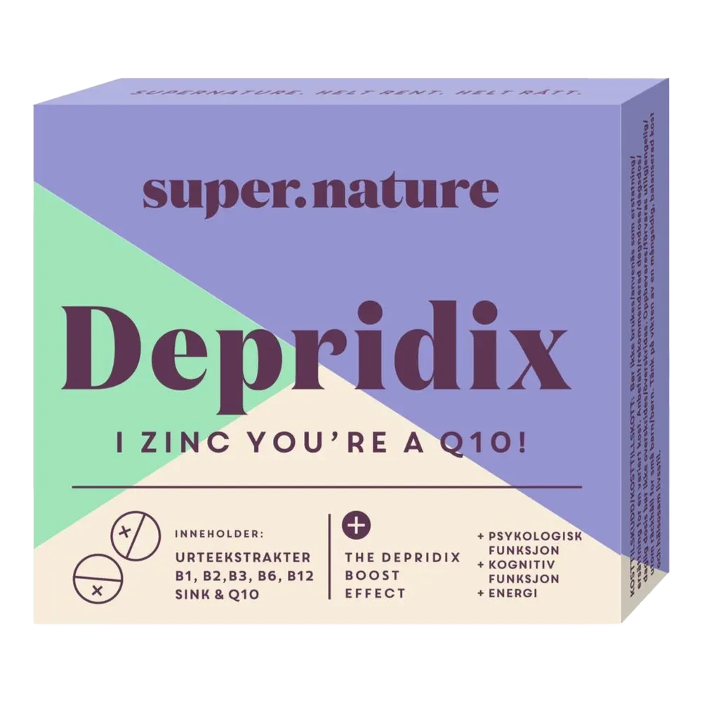 Depridix er et helt unikt og norskprodusert urtetilskudd spekket med energiske B-vitaminer, som niacin, B2 og B12, kombinert med sink og Q10. Verdifulle bidrag til normal psykologisk funksjon, reduserer tretthet og utmattelse, og beskytter cellene dine for oksidativt stress. En skikkelig boost for bÄde kropp og sinn.