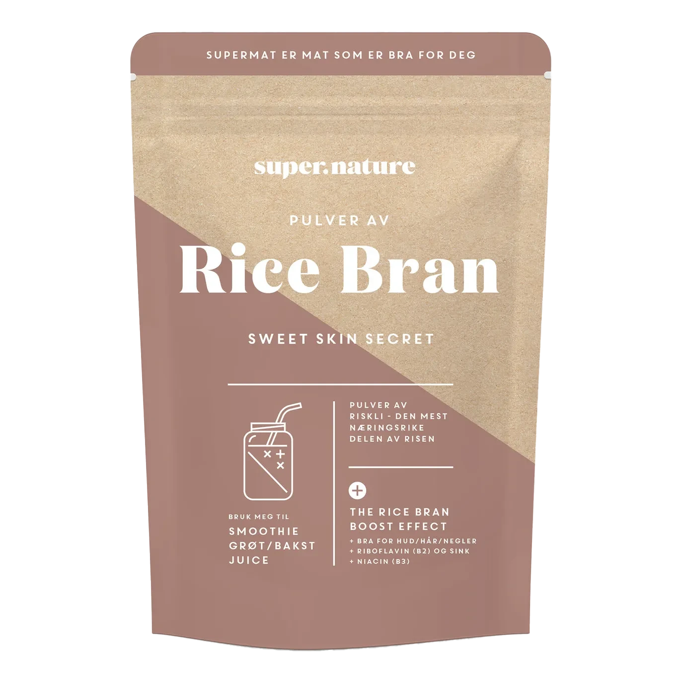 Rice Bran er naturens egen beauty booster. Mye nĂŠring ligger i skallet – ogsĂ„ i ris.  Rice Bran bestĂ„r av den spesielt nĂŠringsrike delen av riskliet som man mister ved koking av ris. Naturlig rik pĂ„ vitamin E, niacin, riboflavin og sink – viktig for hud, hĂ„r og negler. SĂžt og mild i smaken gir pulveret enkelt supernĂŠring til smoothier, bakst eller kalde sauser.