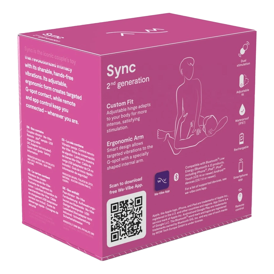 Fjernkontrollen har ogsÄ fÄtt en oppdatering, slik at justering er blitt enklere og hendigere. Sync 2 er selvfÞlgelig fortsatt kompatibel med We-Connect appen for iOS og Android via Bluetooth. Med appen kan en sette sammen individuelle stimuleringsprogram og kontrollere vibrasjonene. Vibrasjon i takt med musikkrytme er ogsÄ mulig. We-Connect appen muliggjÞr seksuell nÊrhet uavhengig av avstanden mellom dere. I tillegg er lyd-, chat- og videofunksjon integrert i appen. Nytelse er mulig overalt og Sync 2 er vanntett.